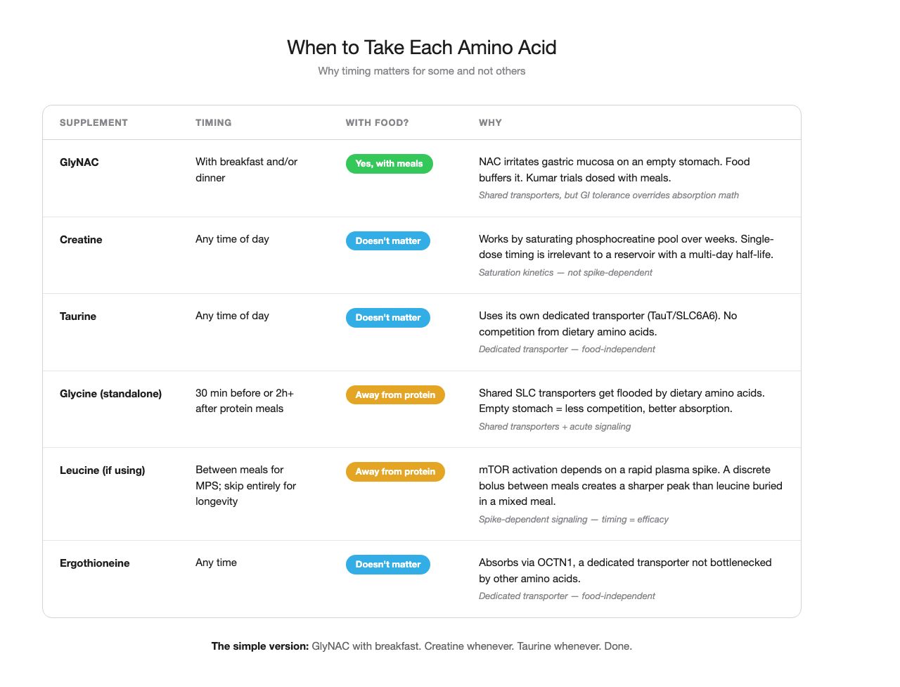 When you take glycine alongside a steak, the glycine is competing with 20 other amino acids for absorption. It’s like one lonely voice trying to shout over a barbershop quartet. Take it between meals or before bed, and it gets VIP access.